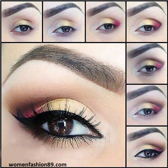 3- Sombra clarinha no primeiro terço da pálpebra. Sombra dourada no centro da pálpebra, sombra avermelhada no canto externo. Após, sombra marrom para esfumar no canto externo. Dourado e marrom na parte inferior dos olhos, delineado e máscara.